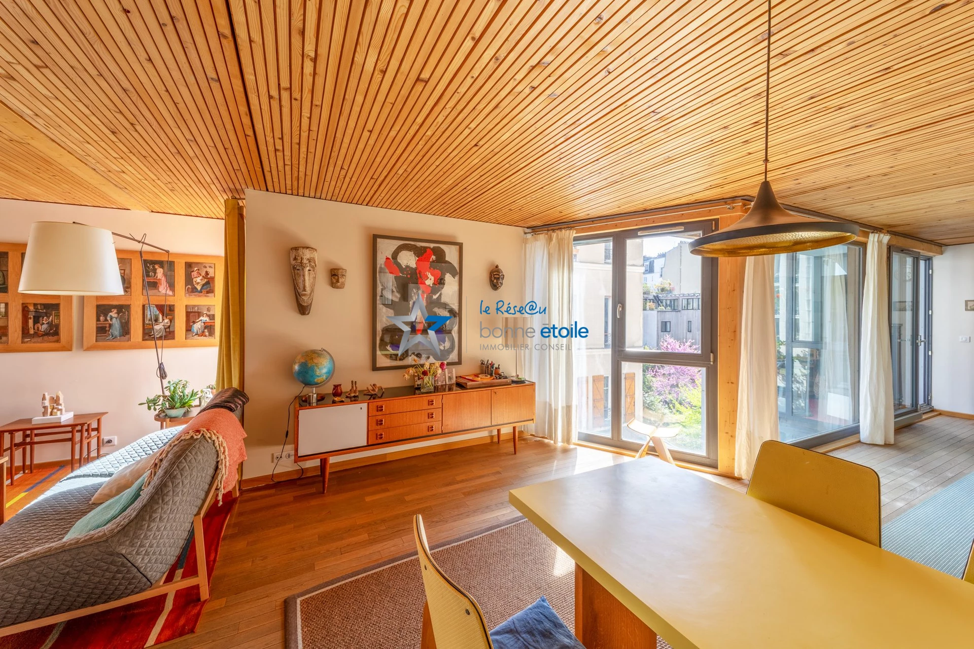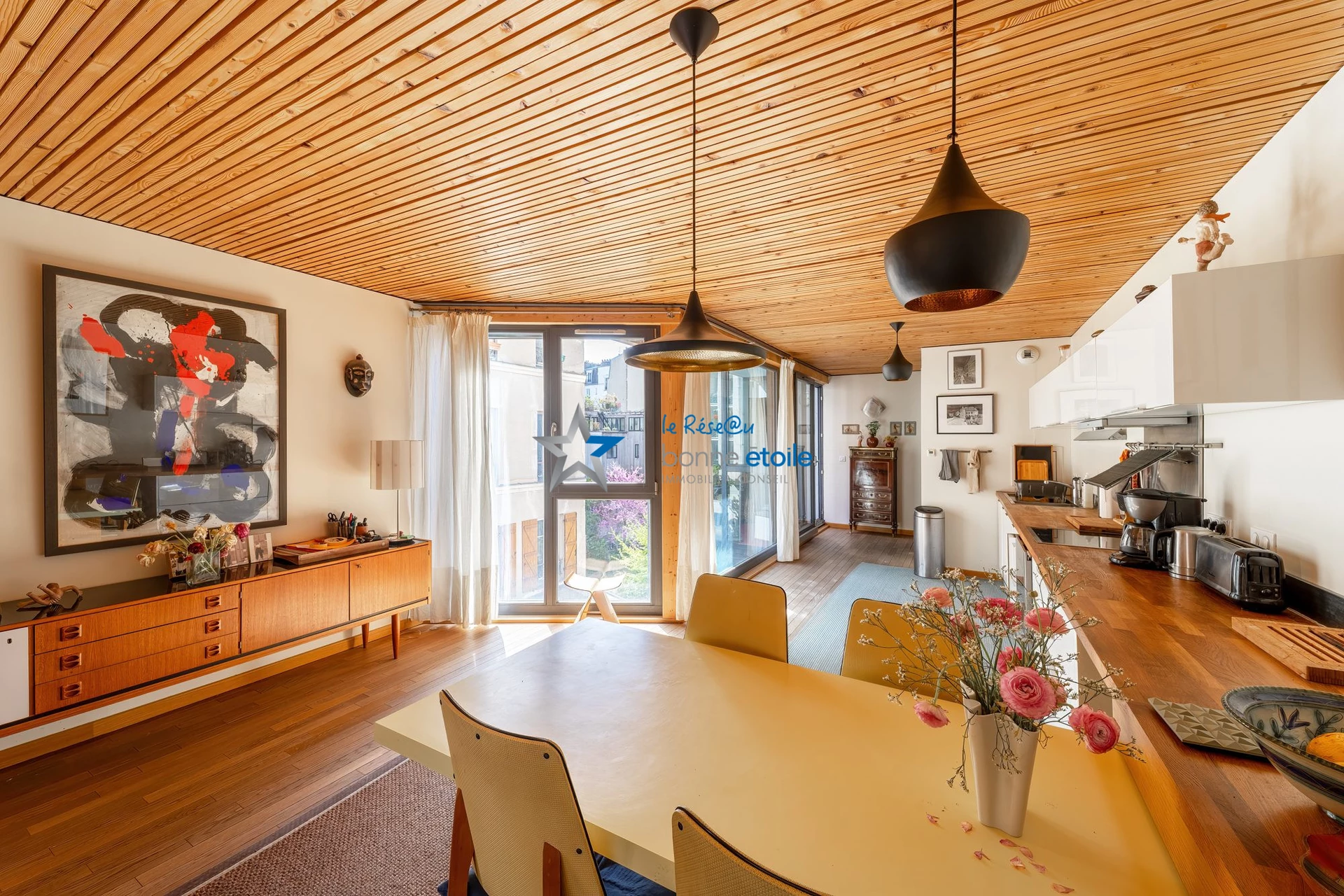 Entre le Parc des Buttes Chaumont et Jourdain, au sein d'un immeuble de 2011 remarquable faisant la part belle au bois et à l'acier, appartement, seul à son étage, bénéficiant d'une exceptionnelle surface vitrée et d'une belle lumière offrant une salle à manger avec une cuisine équipée, un salon lumineux, deux chambres claires, un jardin d'hiver et une buanderie, salle d'eau et toilettes complètent le bien. L'environnement commerçant et verdoyant, le calme, la beauté des lignes et des matériaux, l'équipement haut de gamme, les verrières monumentales confèrent à ce bien une dimension exceptionnelle. Un cadre de vie unique, à deux pas des métros (ligne 11 et 7 bis). Parking vélo.