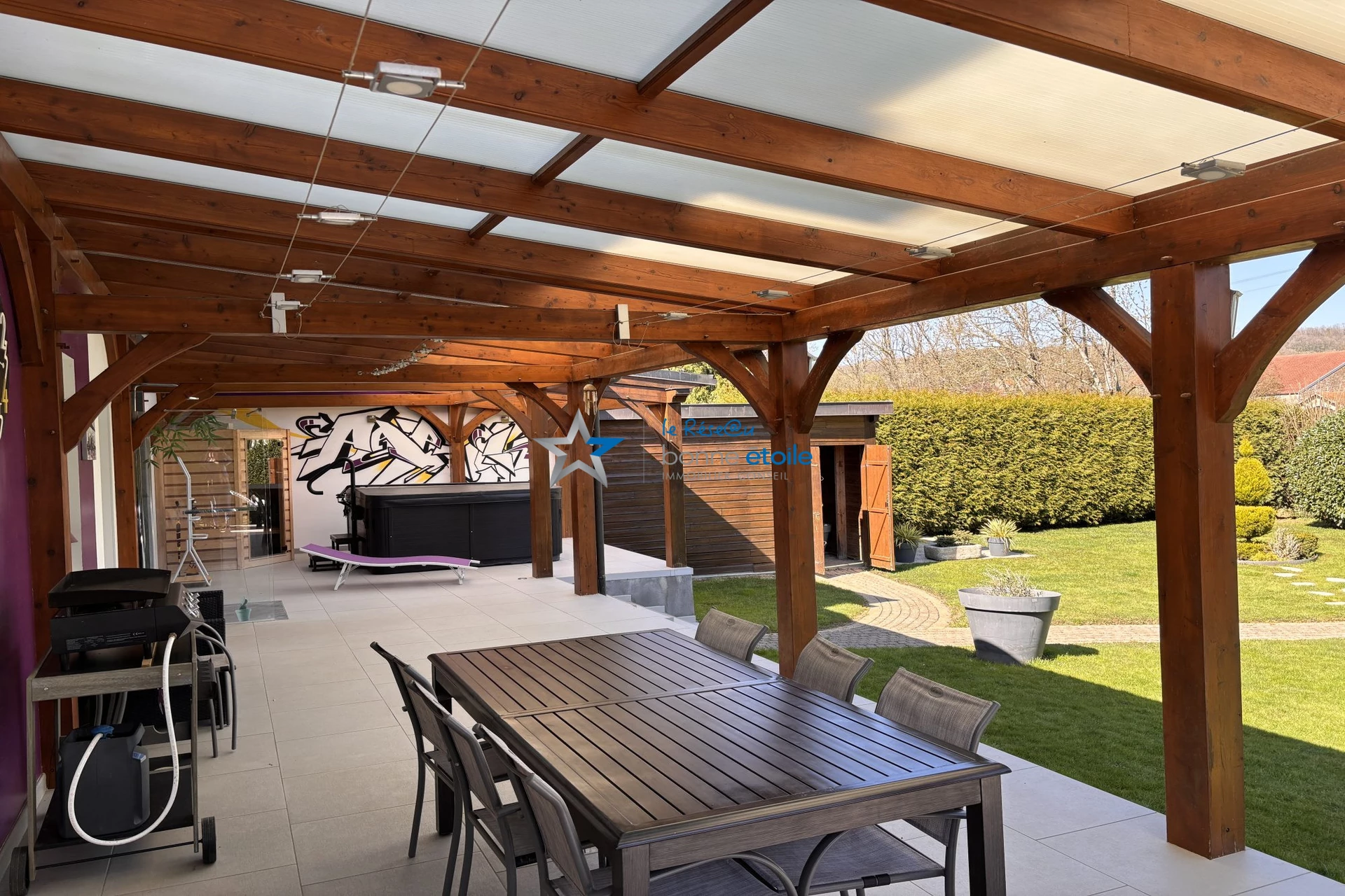Mais le véritable coup de coeur se trouve à l'extérieur : une immense terrasse de 90 m2 vous accueille pour des moments de détente inoubliables avec un jacuzzi 6 places, un sauna 4 places, et une douche extérieure, exposée Sud-ouest un véritable espace bien-être à domicile, avec une vue imprenable sur un magnifique écrin de verdure, arboré de différentes essences, à l'abri de tous regards, parfaite pour profiter des beaux jours et des couchers de soleil enchanteurs en toutes saisons.